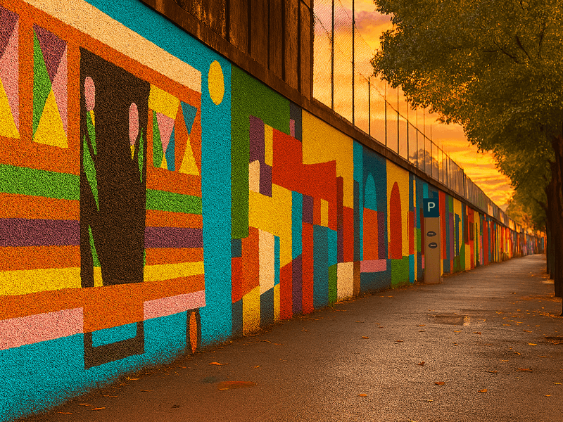 Nel cuore della Riva Ostiense, lungo il tratto murario di via del Porto Fluviale, si sviluppa l’opera murale realizzata da Mattia Botta, in arte Geometric Bang. L’intervento artistico si articola in una sequenza di riquadri narrativi che alternano ritratti stilizzati, elementi architettonici e composizioni geometriche astratte.